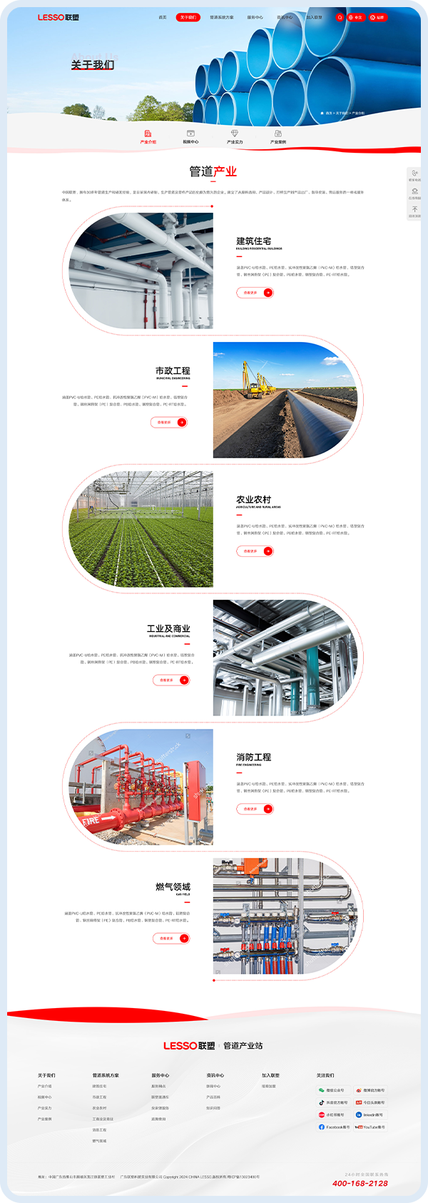 整体效果 网站以清晰的层级架构和场景化设计,实现信息高效传递:用户可快速定位目标领域产品,通过功能入口解决实际需求,同时通过荣誉展示与技术细节感知品牌实力。整体风格简洁专业,既满足 B 端客户对产品细节的查询需求,也让 C 端用户感受到服务便捷性,成功塑造 “全场景管道解决方案提供者” 的品牌形象。